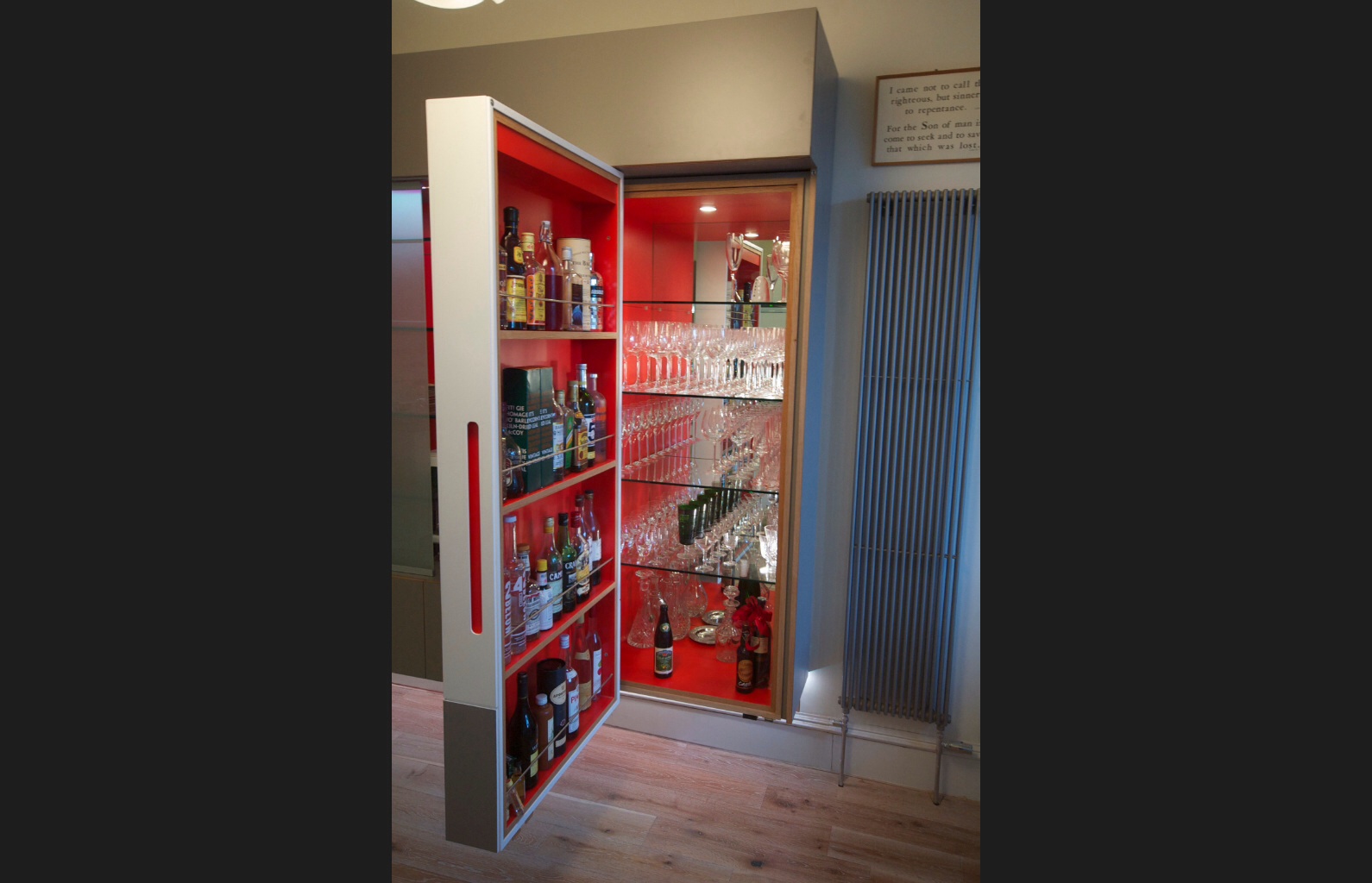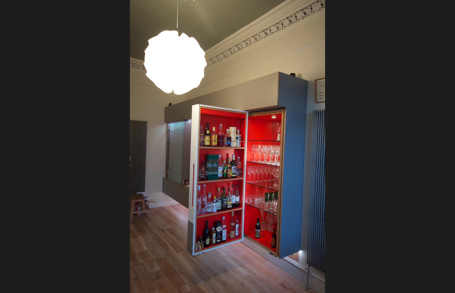 In-built solutions: This project involved several fitted furnishings throughout the home and had extensive design input by clients Werner and Catherine. The largest piece being a huge floating storage solution, within which was housed a discrete drinks cabinet, a computer station and an expansive number of display shelves.