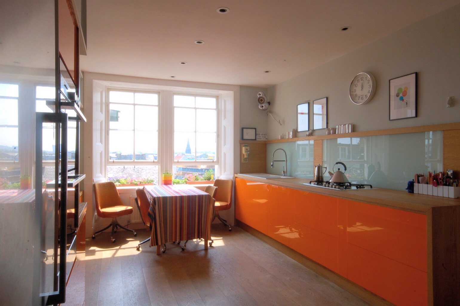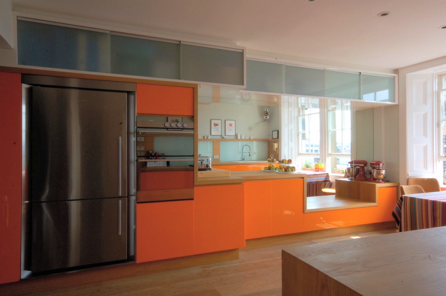 Design, fabricated and fit made to measure kitchen units, work tops, mirrored wall and lit splashbacks.